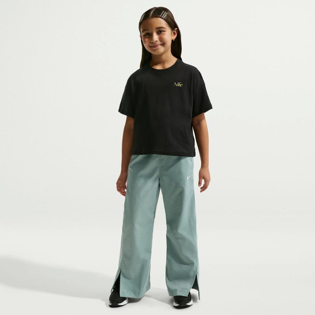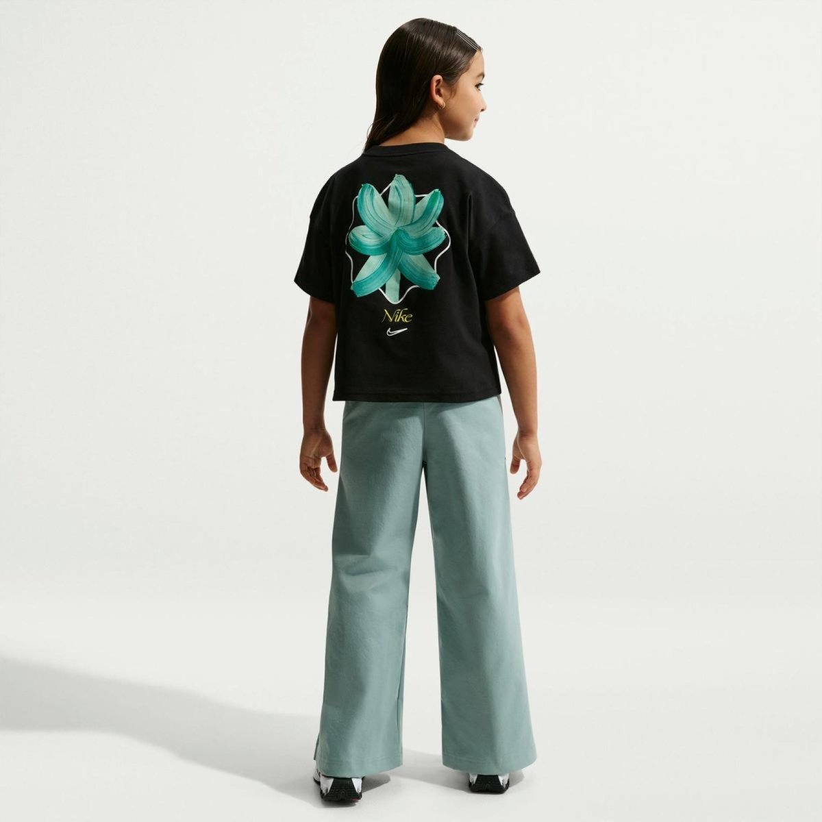 Детская футболка NIKE G NSW Tee OC Boxy Flower — свободная oversized-модель в чёрном цвете с цветочным принтом для девочек-подростков из коллекции Nike Sportswear Open Concept.