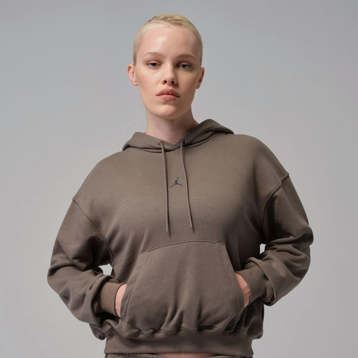 Технология Dri-FIT в сочетании с материалом French Terry: отвод влаги и комфорт при активных тренировках и изменении активности.Состав: 70% хлопок / 30% полиэстер – натуральная мягкость и удобная терморегуляция для ежедневной носки в прохладную погоду.Свободный крой (Loose Fit) – расслабленная посадка, комфортно сочетающаяся с тайтсами или леггинсами.Капюшон со шнурком и кенгуру-карман впереди – стандартная конструкция для комфортной носки.Резинки на манжетах и по низу толстовки - сохраняют форму изделия и поддерживают тепло.Логотип Jordan Jumpman и брендинг Jordan Sport.