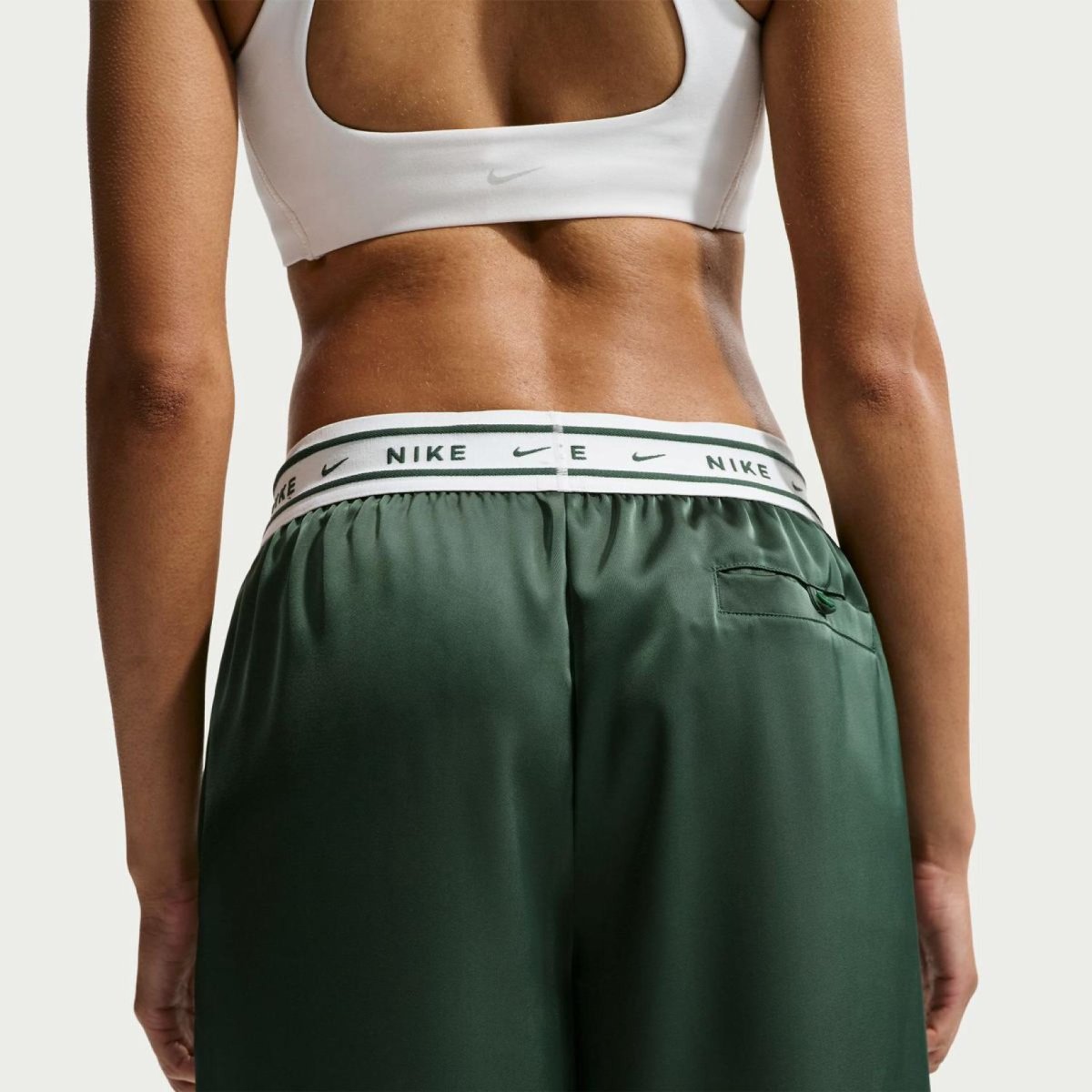 Жіночі штани NIKE Sportswear Offline Woven Satin — атласні штани середньої посадки у відтінку Bicoastal/Vintage Green, поєднання ніжного блиску сатину та повсякденної зручності.