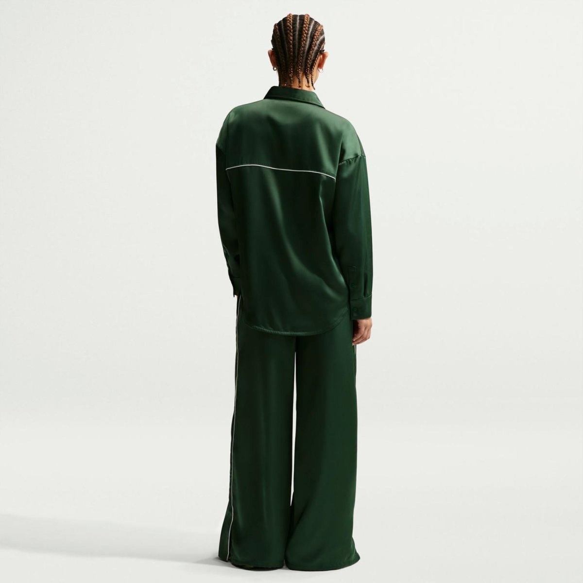 Жіноча атласна блуза NIKE Sportswear Offline Woven Satin LS Top — вишукана модель із довгим рукавом у зеленому кольорі із гладкої сатинованої тканини для повсякденного стилю NSW.